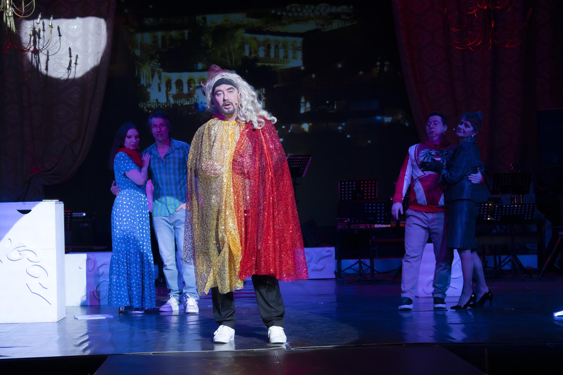 Dar, nu surprinzător, desi locul acțiunii pare să fie pe meleagurile strămoșilor din partea lui Traian, San Remo se ține totuși anul ăsta în Dacia Felix la Pitesci – și se și explică foarte clar soluția salvatoare. Caleidoscopul satiric nu permutează felii de realitate italiană – italienii suntem noi. Sub masca și cu accentul „dolce vitei” meridionale temperamentul latin carpato-danubian se înfățișează în toată spendoarea sa neaoșă contemporană – cu aromă de „telemea și mosc” cum se exprimă un personaj alunecat pe cărările divinei comedii în tunelurile energetice de sub Carpați. Între gondola, discoteci și catedrale vă invităm la o seară de bună dispoziție cu commedia dell-arte, mafioți și partizani cu hohote, muzică și dansuri spectaculoase și imagini de poveste nu-n Santa Cita, ci la Davila. Nu știm înainte sau după, dar cât timp petreceți la ”Bella Italia” – „La vita e bella!”